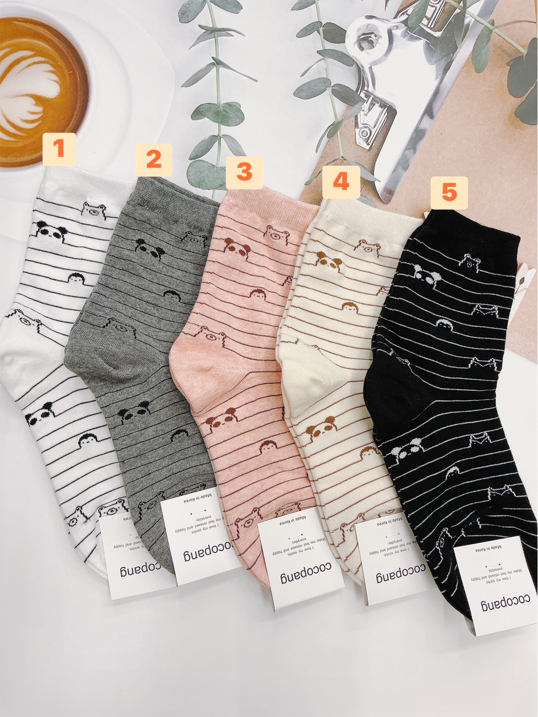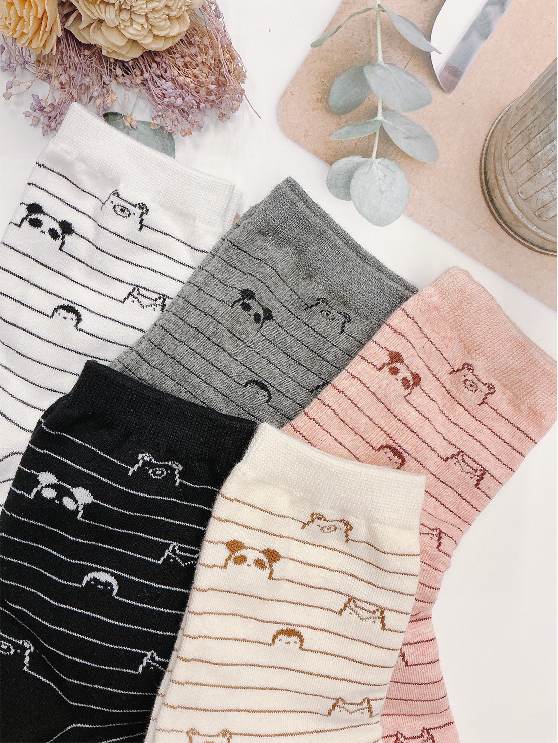 韓國製造~線條熊貓臉 二分之一襪