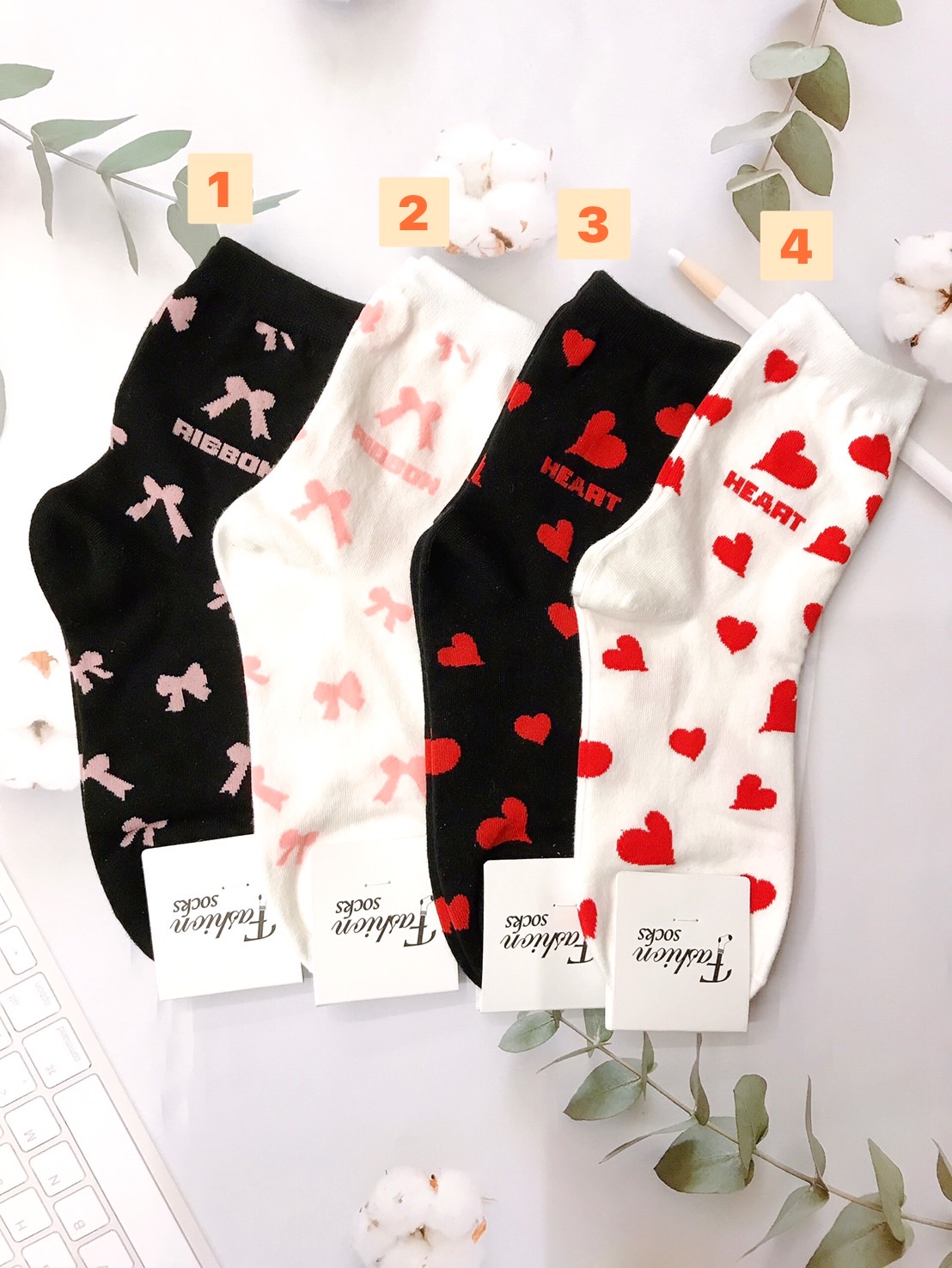 韓國製造~滿版蝴蝶結愛心組合 二分之一襪