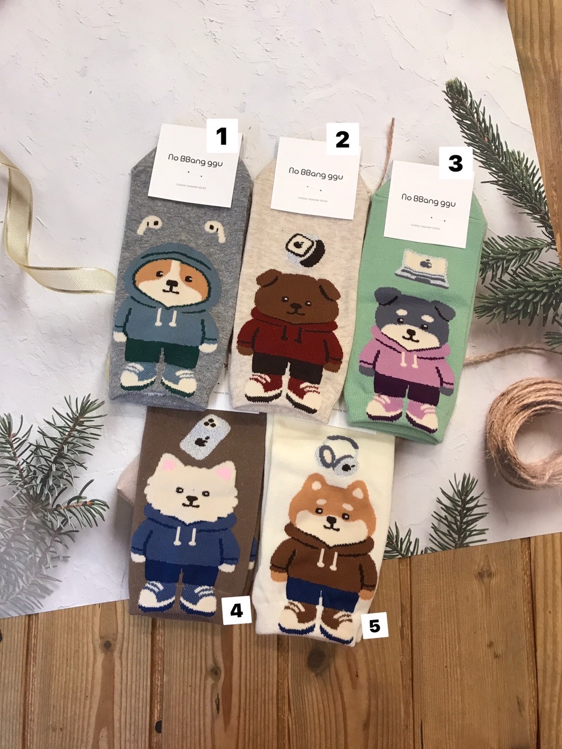 韓國製造~雙色皺皺小熊頭 二分之一襪