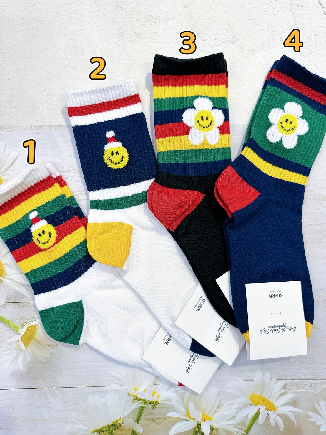 韓國製造~彩虹條紋笑臉 二分之一襪