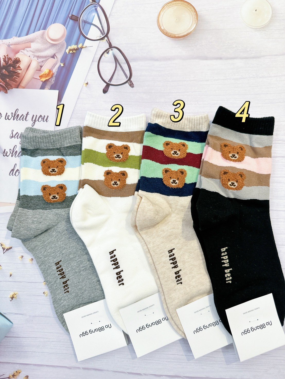 韓國製造~彩條串串熊 二分之一襪