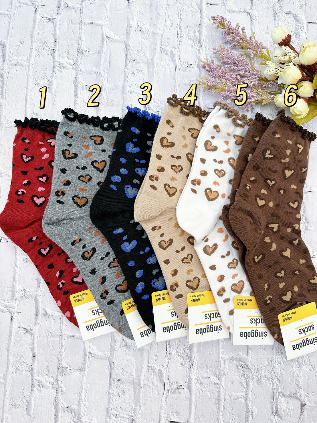 韓國製造~泡泡花邊雙色愛心 二分之一襪