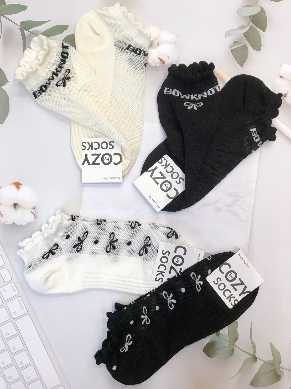 韓國製造~黑白蝴蝶結超彈性網格 短襪