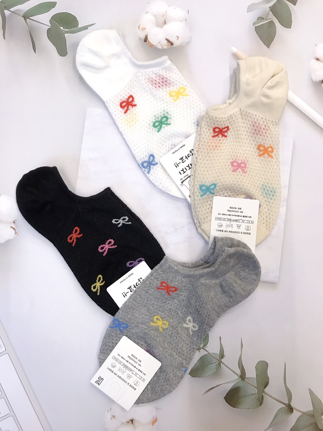 韓國製造~網格彩色蝴蝶結 隱形襪