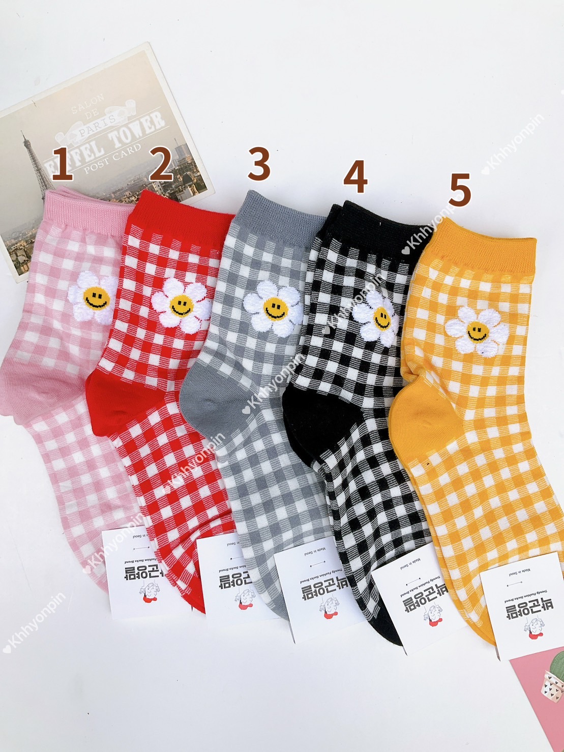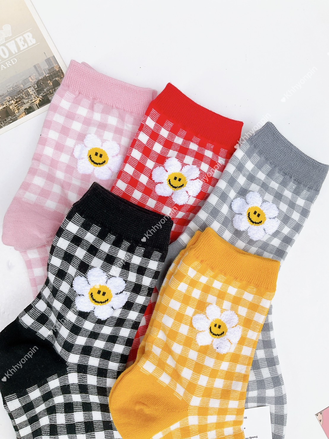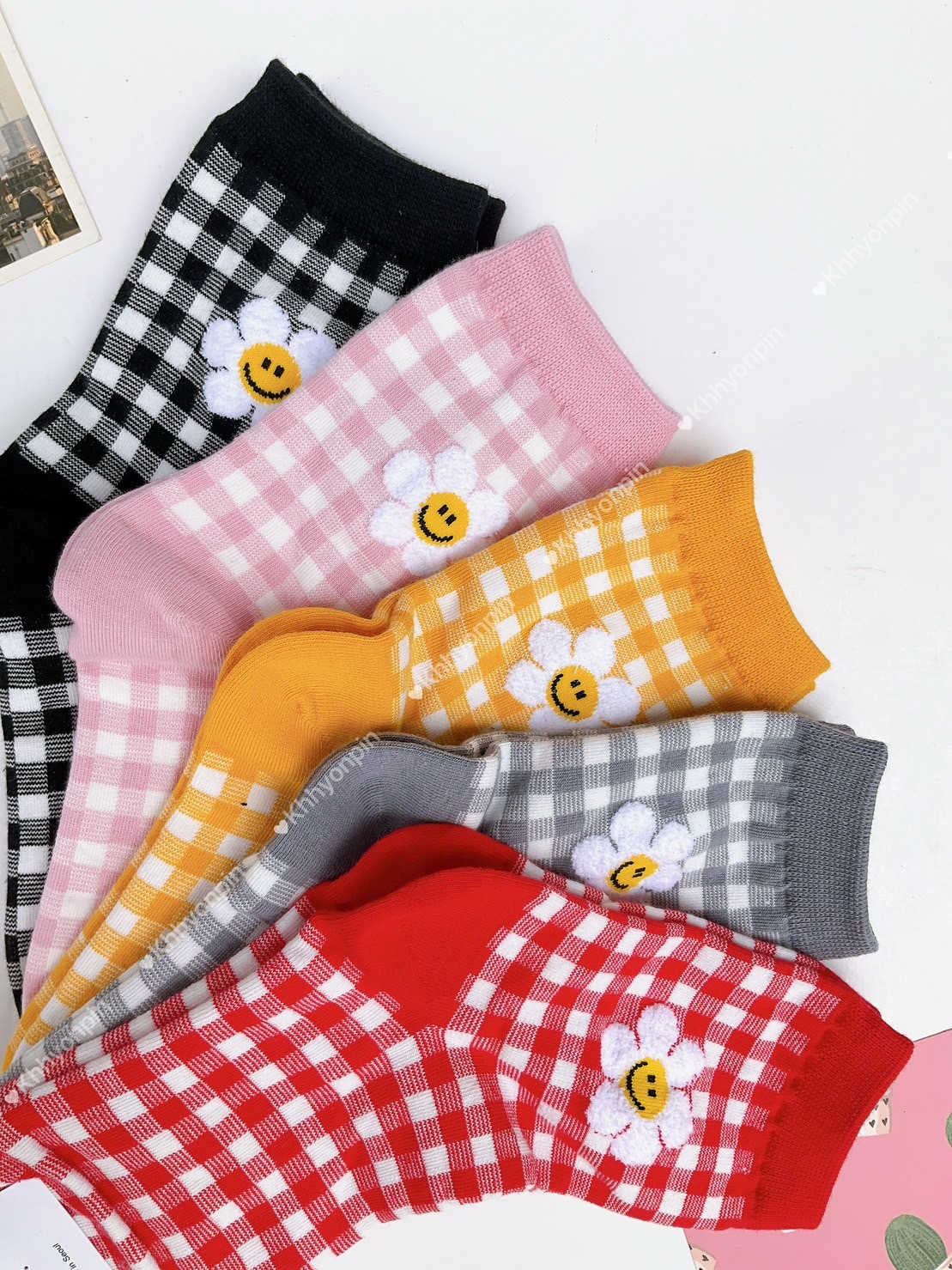 韓國製造~細格笑臉太陽花2/1襪
