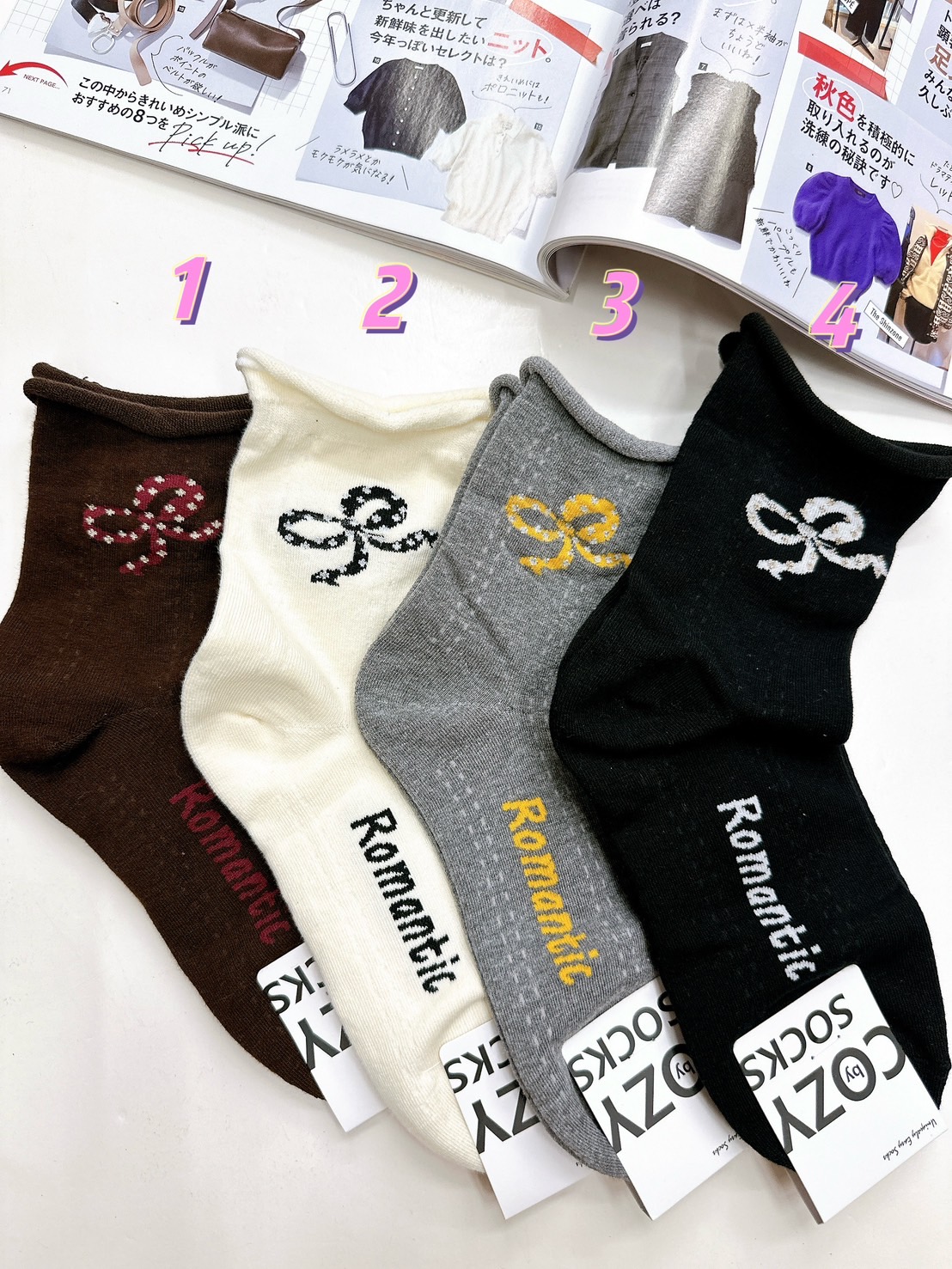 韓國製造~捲邊蝴蝶結線條 二分之一襪