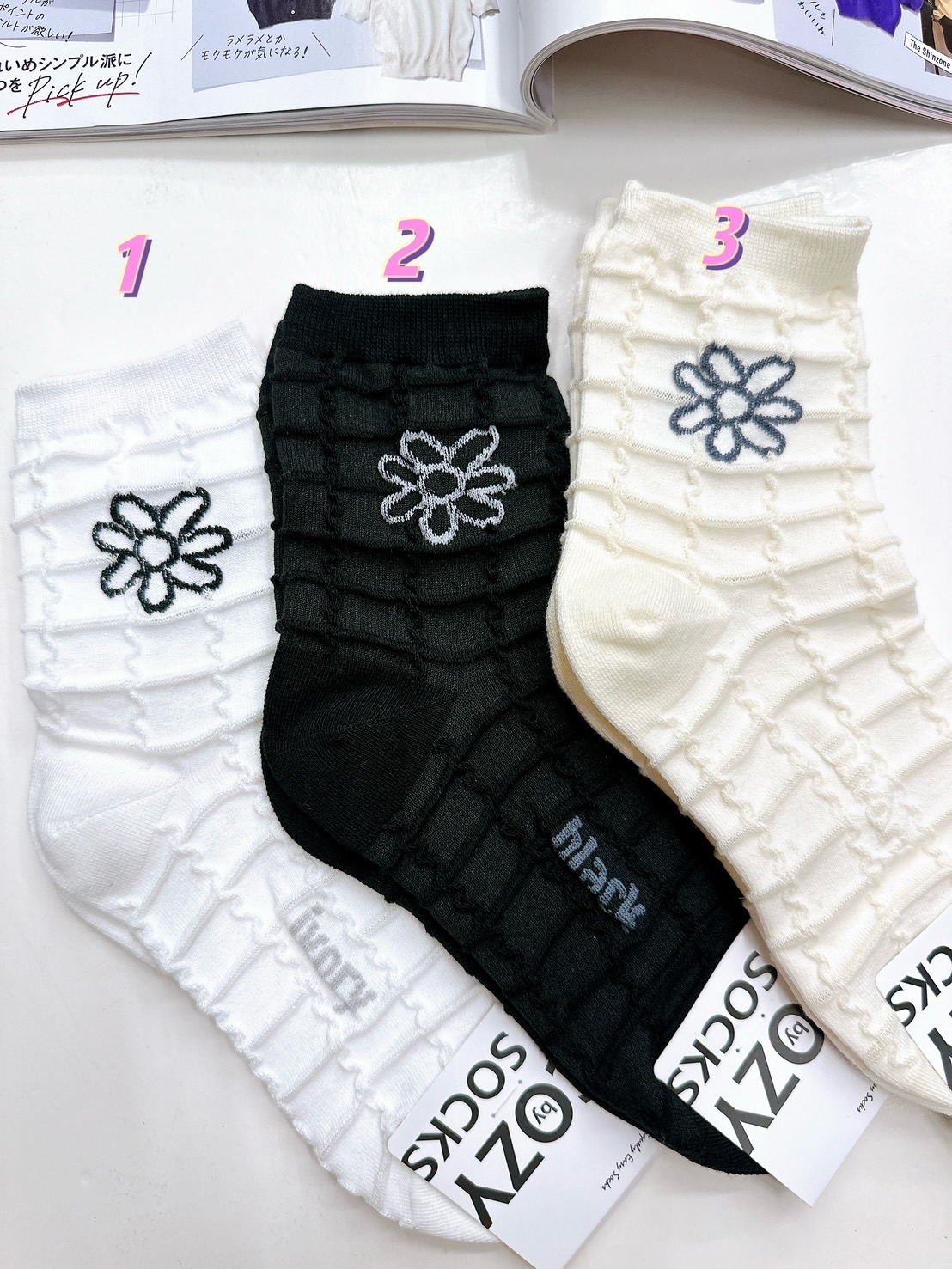 韓國製造~浮雕格小花 二分之一襪