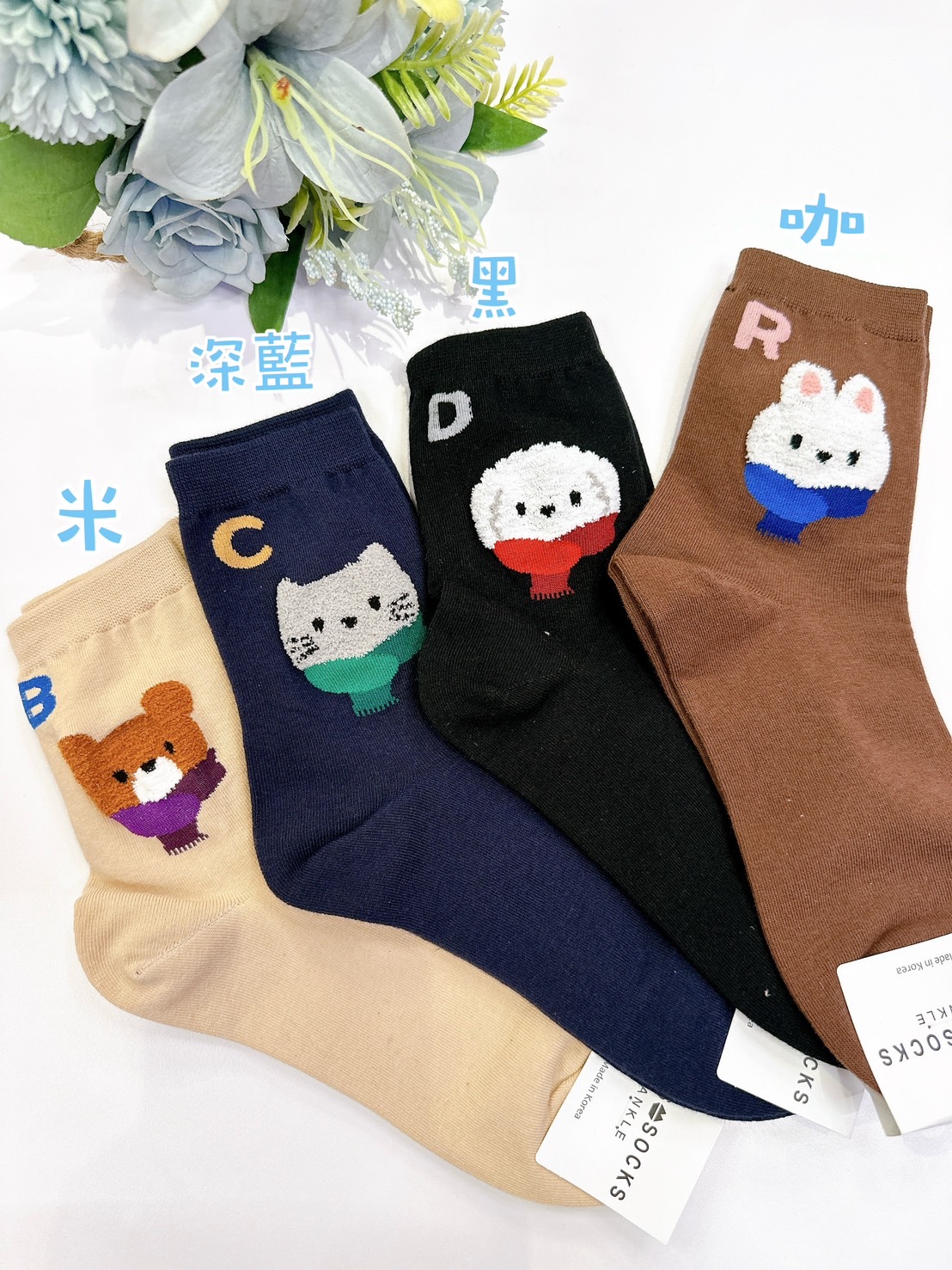 韓國製造~字母動物頭 中筒襪