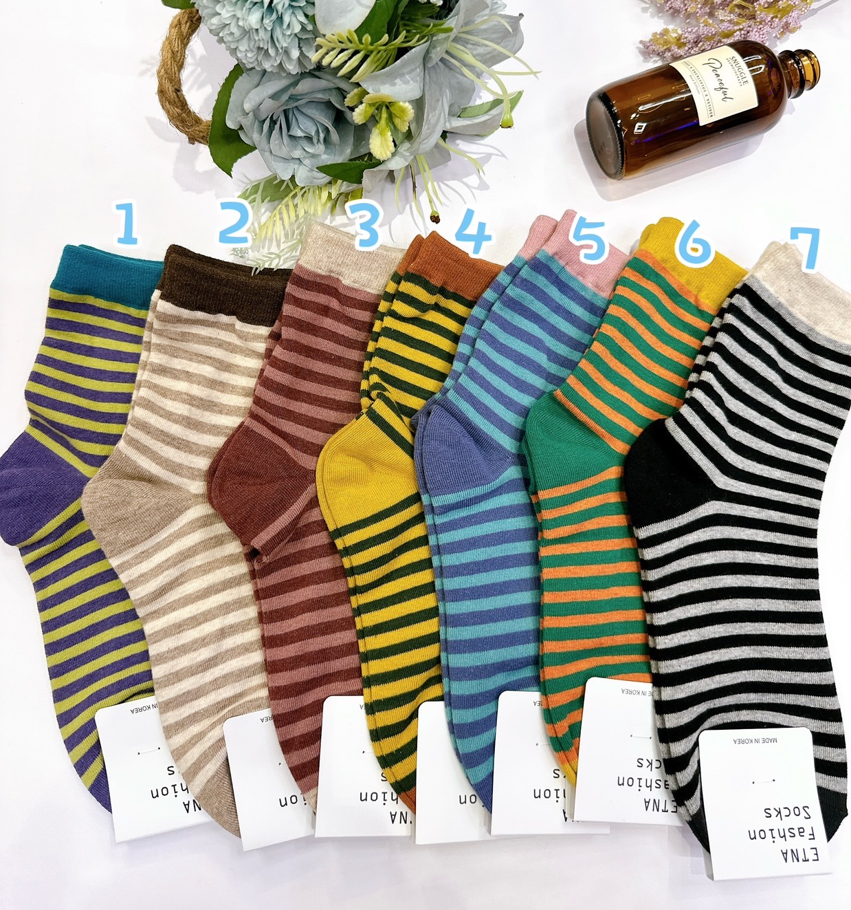 韓國製造~條紋不束腳捲邊 二分之一襪