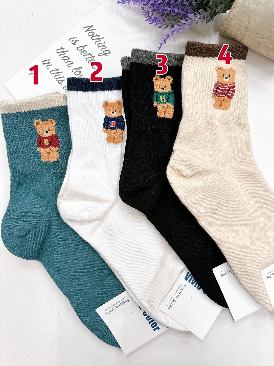 韓國製造~襪口雙色萌熊 二分之一襪