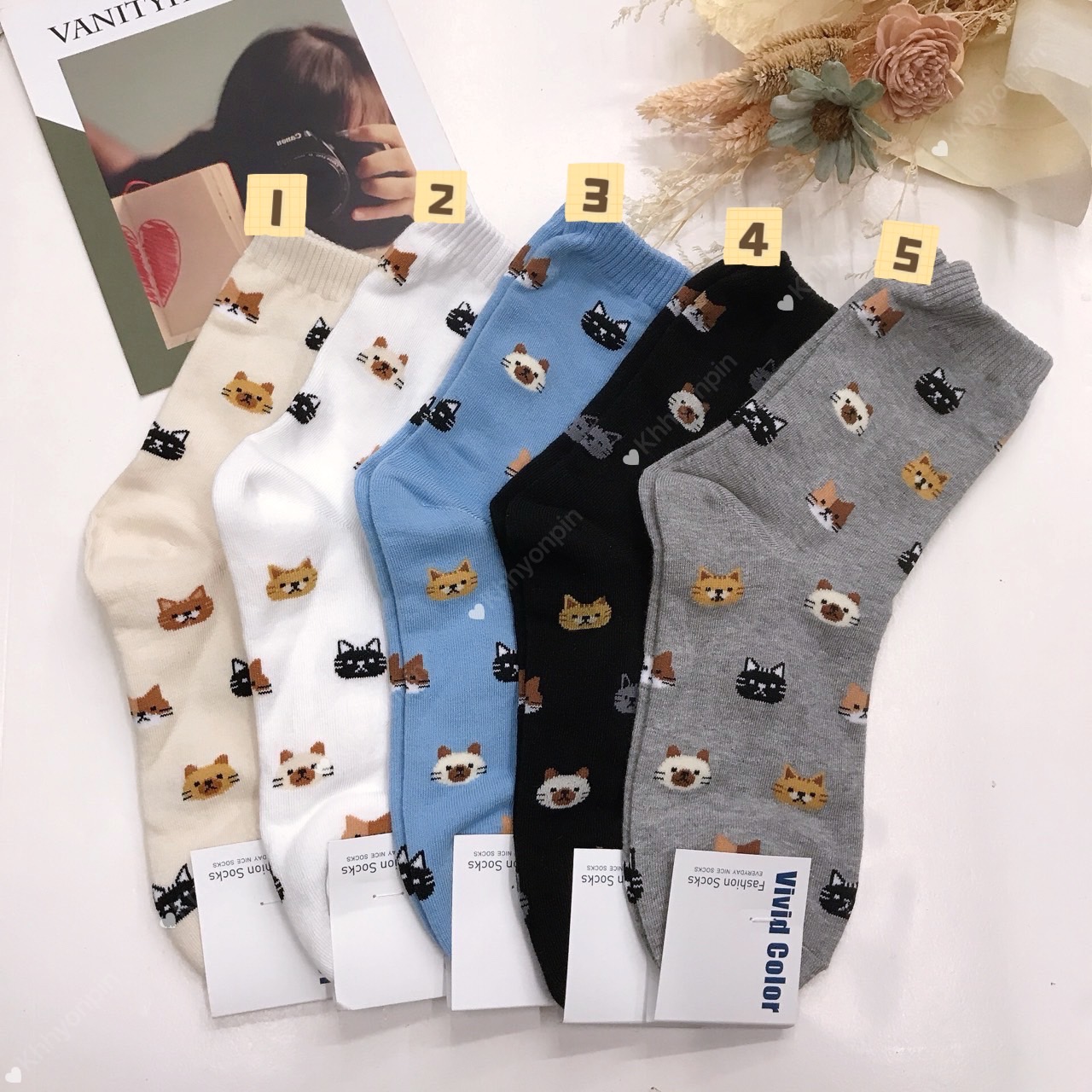 韓國製造~滿版小貓頭 二分之一襪