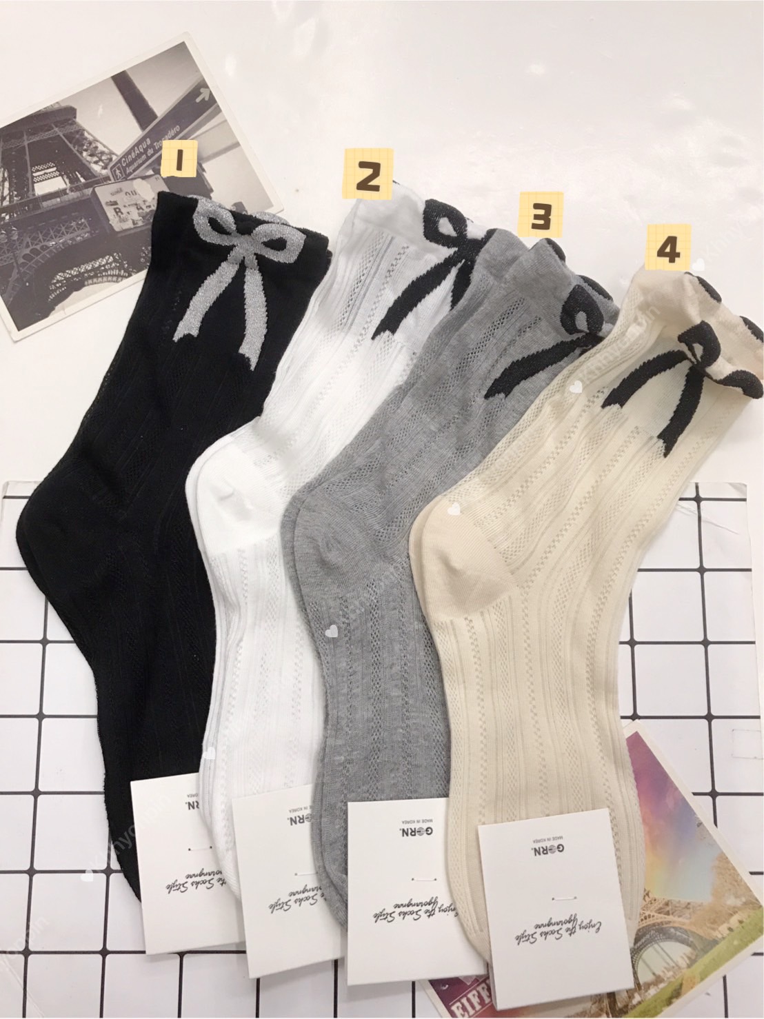 韓國製造~直條壓紋蝴蝶結 二分之一襪