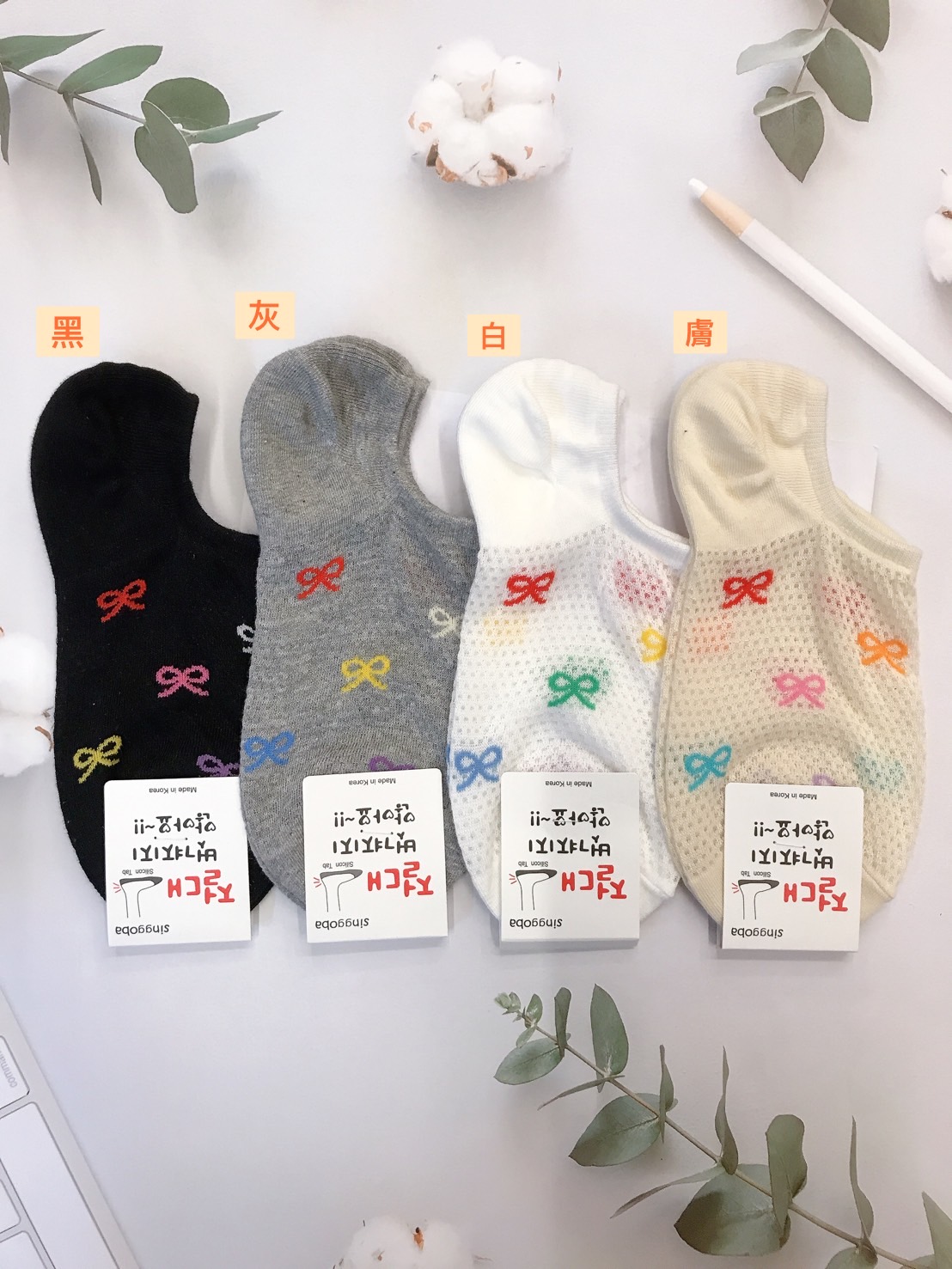 韓國製造~網格彩色蝴蝶結 隱形襪
