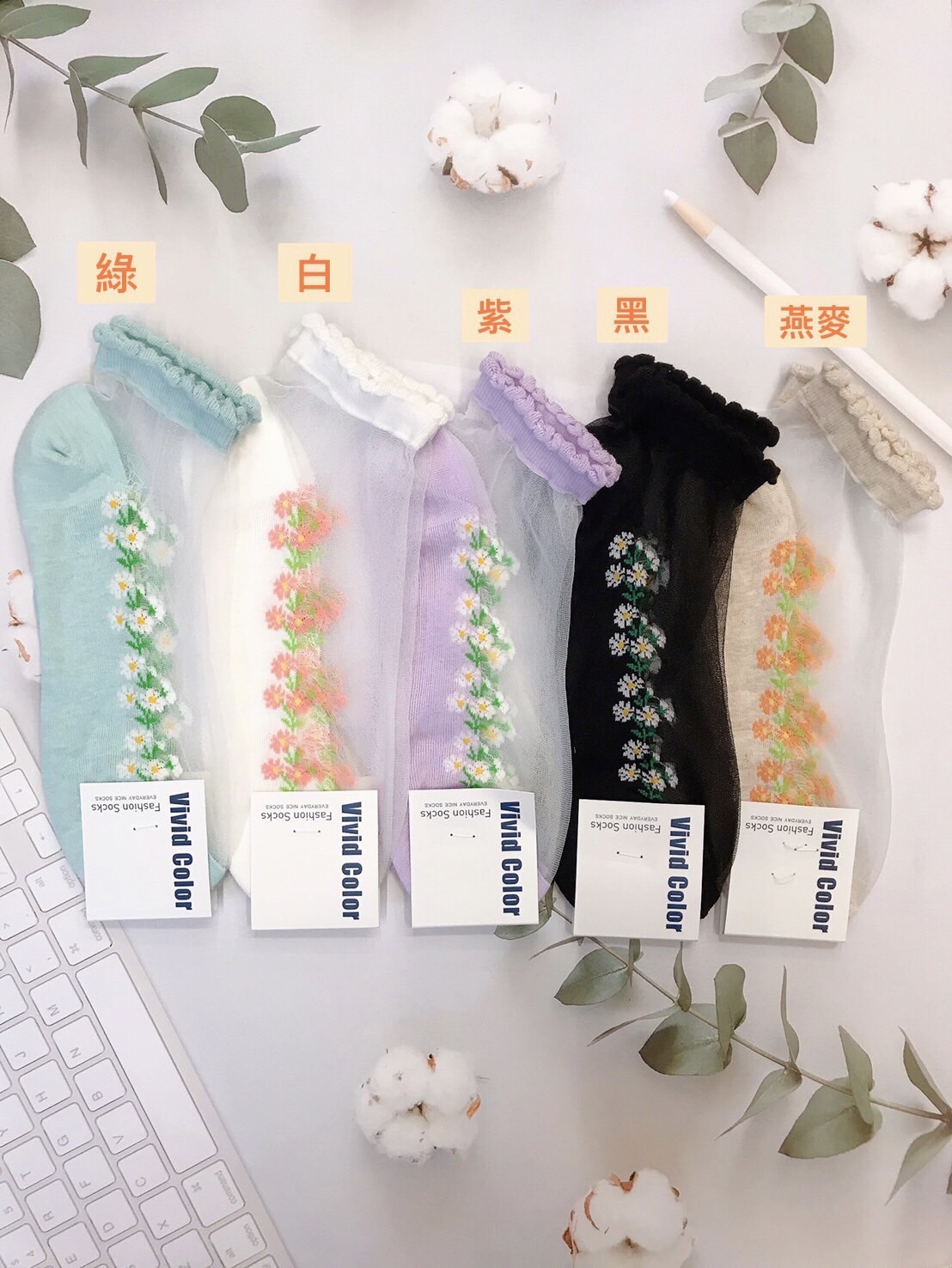 韓國製造~透膚側邊花朵 短襪