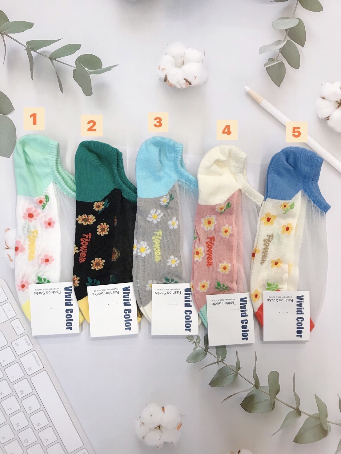 韓國製造~透膚拼色側邊花朵 隱形襪